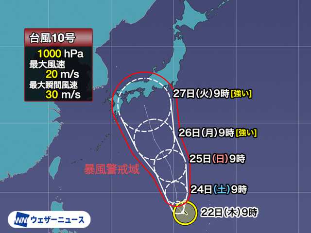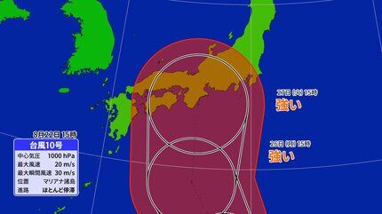 @wni_jp【台風情報】 8月22日(木)15時現在、台風10号(サンサン)はマリアナ諸島でほとんど停滞しています。 今週末は暴風域を伴って小笠原近海を北上し、来週は本州付近に大きな影響が出る可能性が高まっています。今後の進路・台風情報に注意してください。 weathernews.jp/s/topics/20240… pic.x.com/5bwbmu8d31