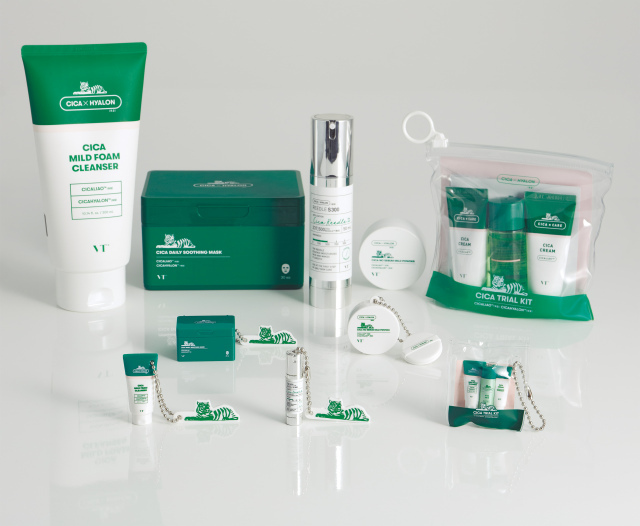 同商品は、「VT COSMETICS」で人気の高い「CICA」シリーズを中心に、クレンジングフォーム、シートマスク、美容液、パウダー、トライアルキットがミニチュアチャームになっている。